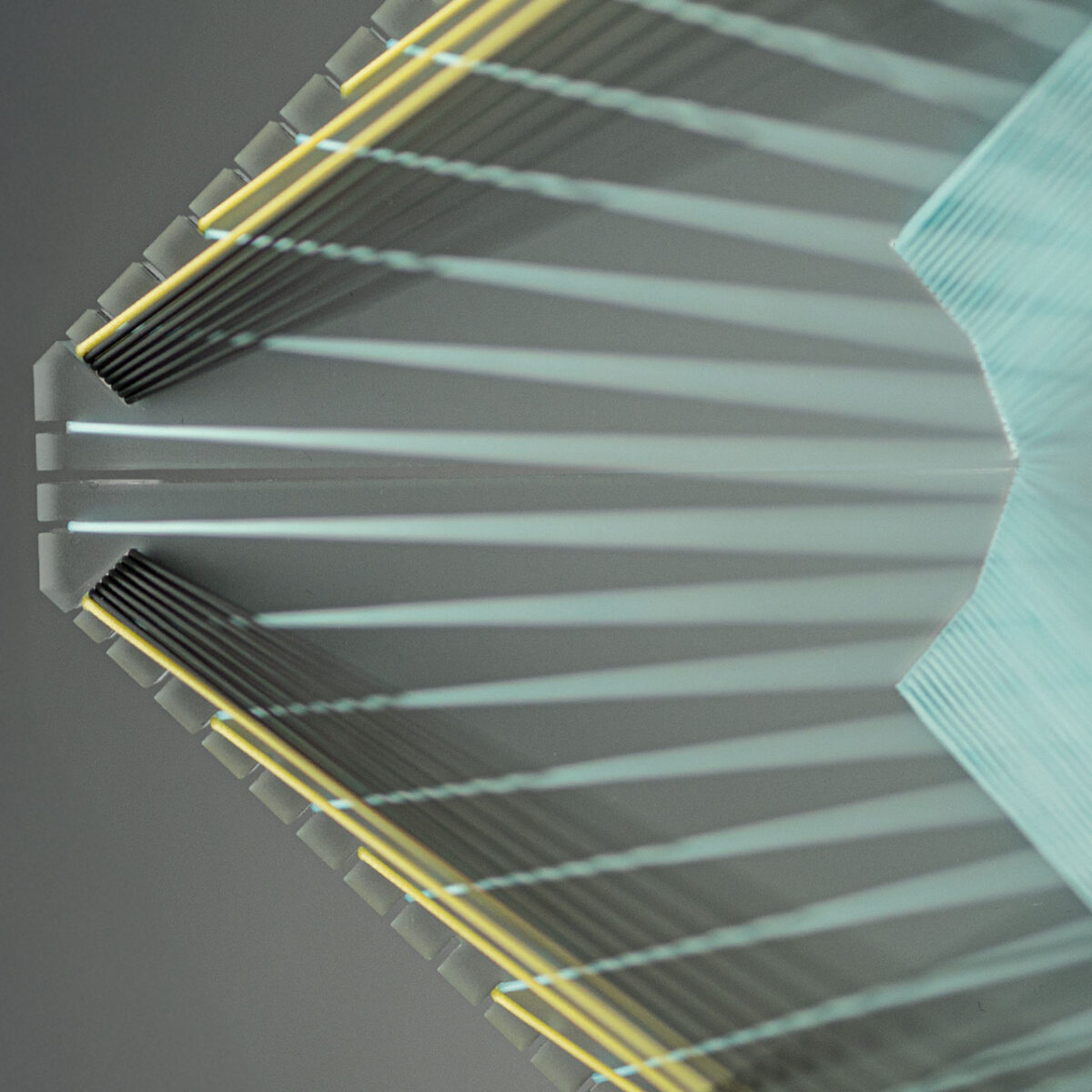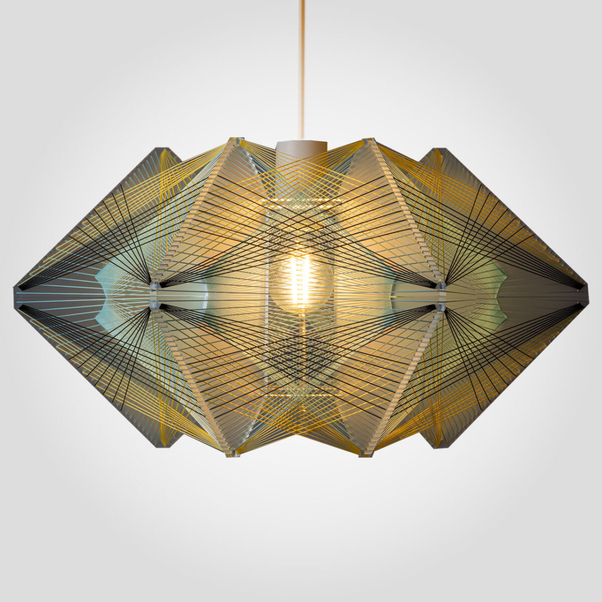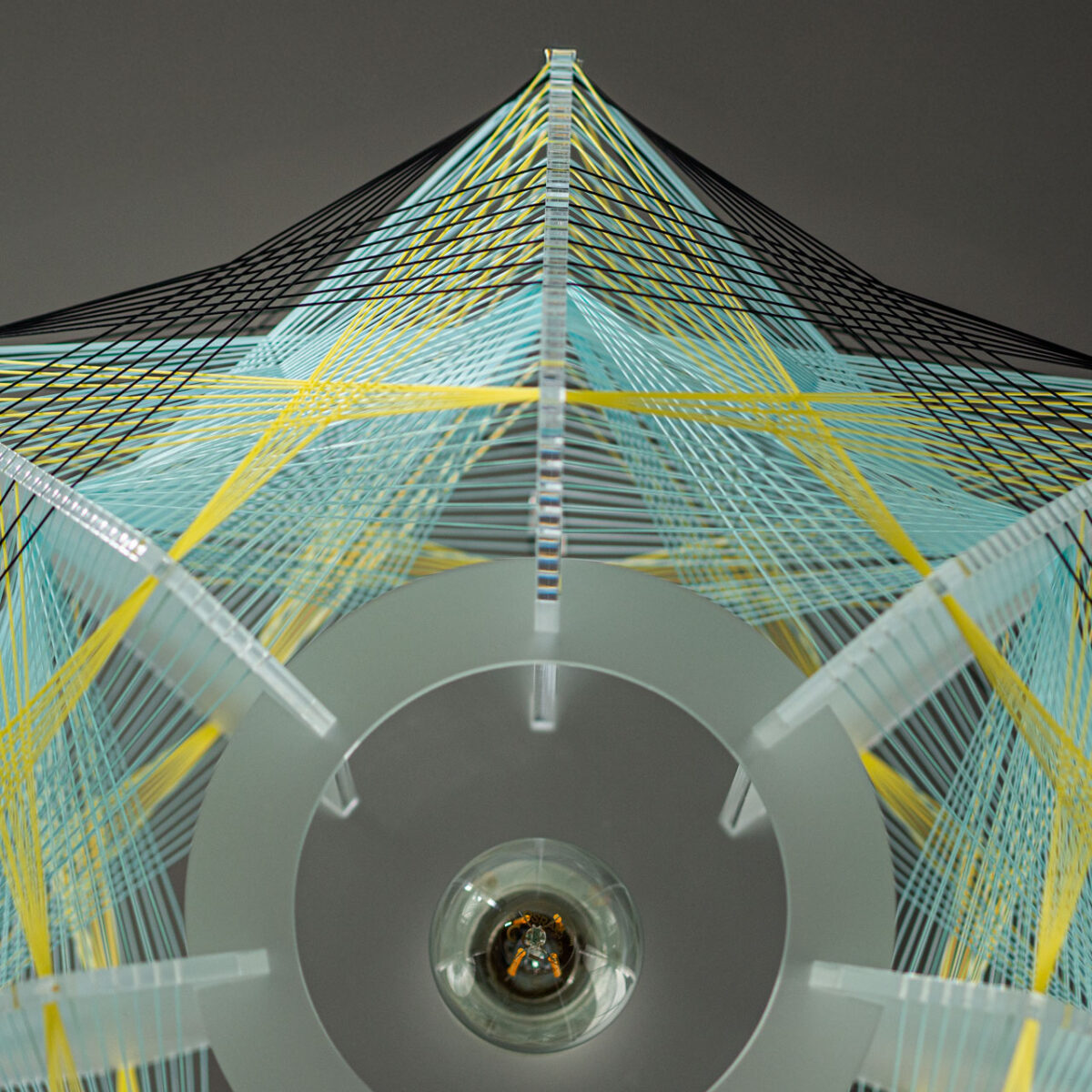 Jej abażur wykonany jest ręcznie plecionych żyłek. Całość osadzona jest na stelażu z pleksi. Będzie idealnym źródłem światła do czytania, pracy lub relaksu.